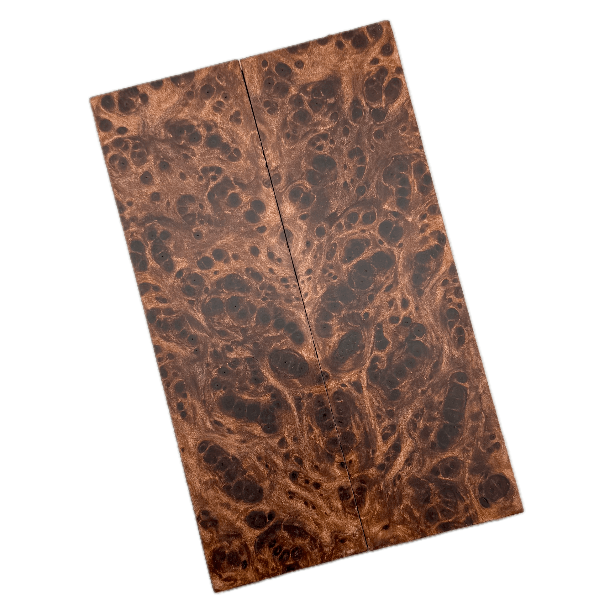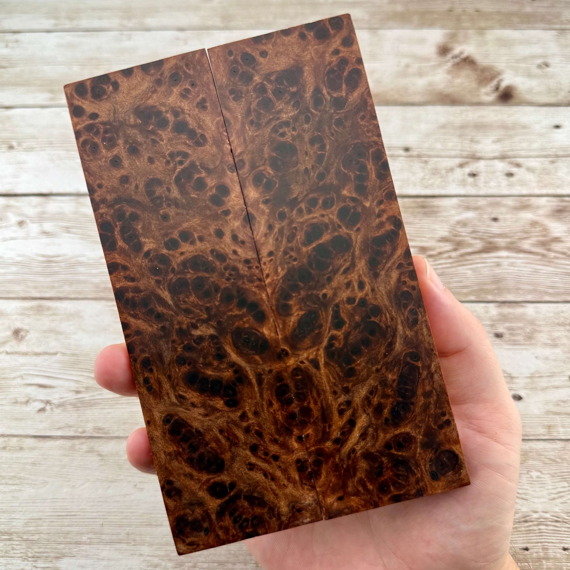 Gorgeously figured redwood burl scales with all kinds of eyes, figure, and great chatoyance. Redwood burl is a favorite of ours here at Knife Handle Supply, and with proper stabilization, makes for one heck of a knife handle!